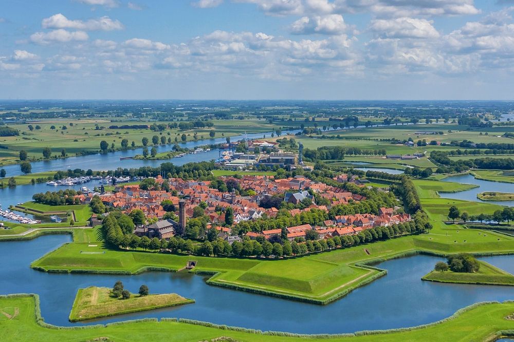 The old fortified town of Heusden seen from the air. You can clearly see the city wall surrounding the centrally located village. The beautiful dutch sky above makes it complete.