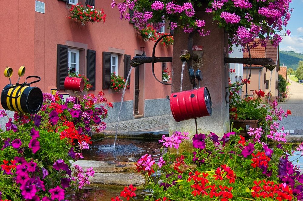 Flower-decorated fountain in the village of Frachwerk in Alsace