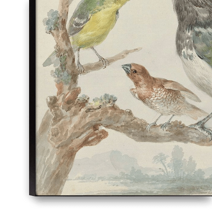 Buy Four Different Birds on a Branch, Aert Schouman as a reproduction on canvas, ArtFrame, poster and wallpaper, printed on demand in high quality.
