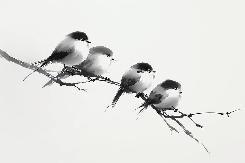 Buy this bird art Four Little Birds by Bianca ter Riet on canvas, ArtFrame, poster and wallpaper, printed on demand in high quality.