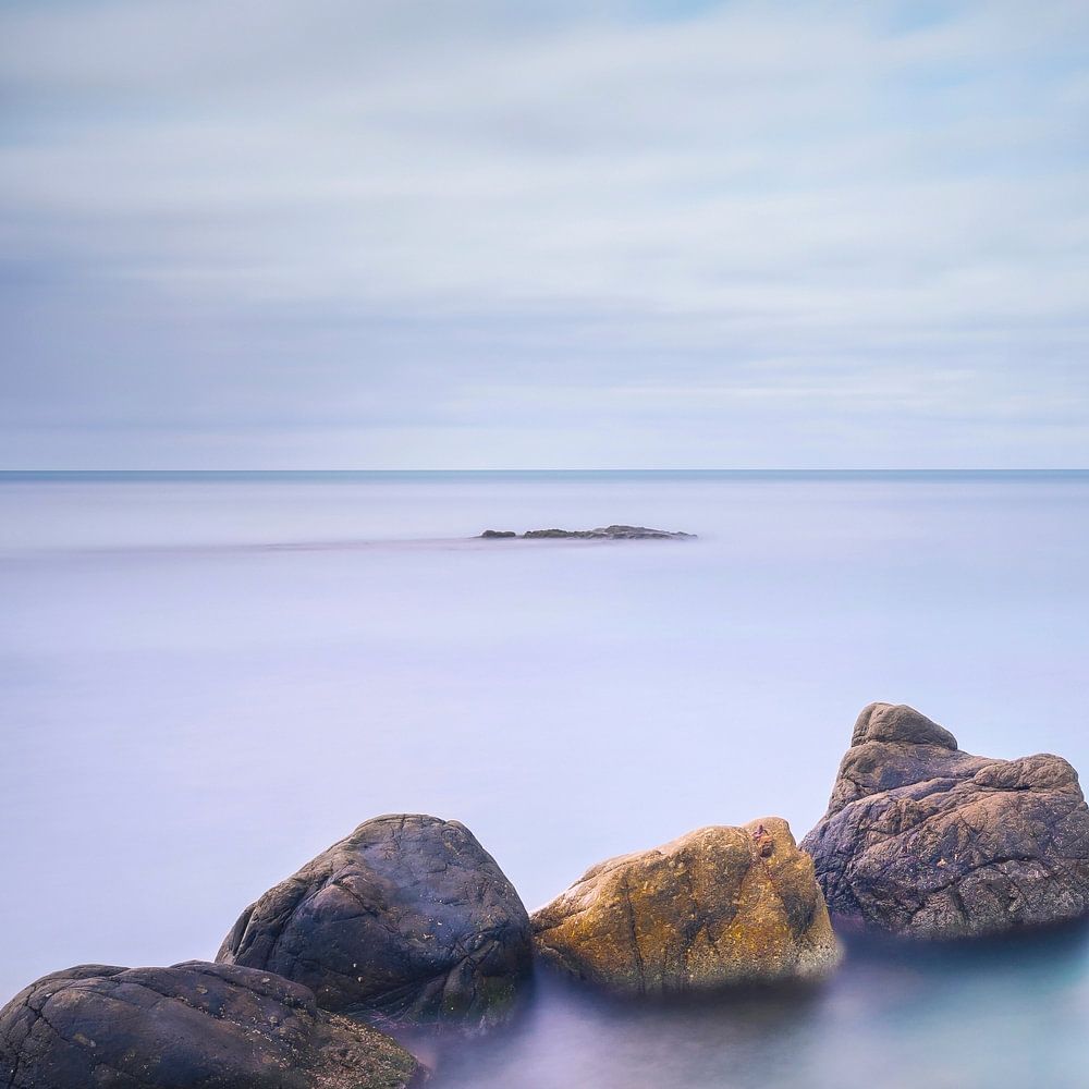 Rocks, sea, and clouds in the sky, beautiful seascape in long exposure photography. Castiglioncello, Tuscany region, Italy.