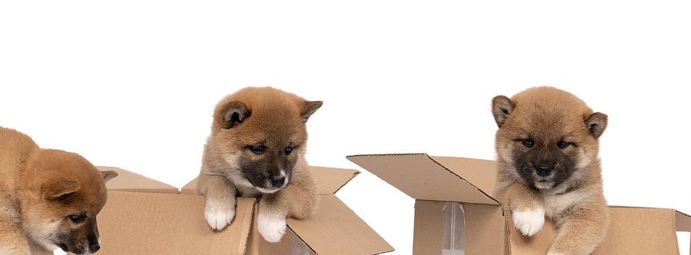 Four Shiba Inu puppies sitting in a cardboard box panorama against a white background