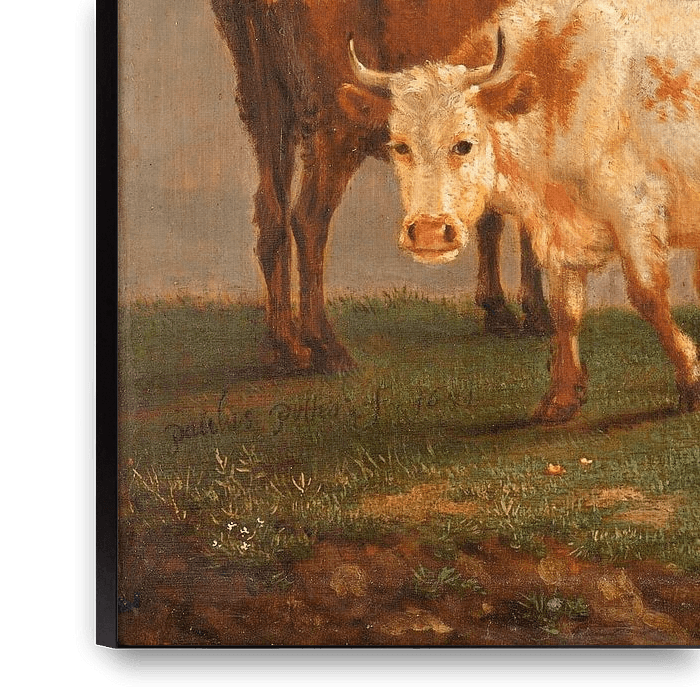 Paulus Potter was the first painter to give Dutch cattle the lead role in his work. In this painting, they are four cows. They stand out sharply against the dark cloudy sky. Their heavy bodies cast dark shadows. The sinewy beasts are also so impressive because Potter chose a low vantage point.