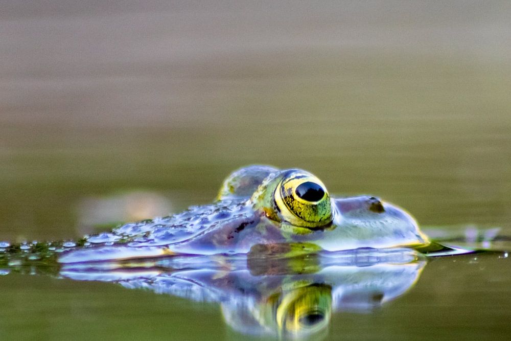 Graceful portrait of a water frog with large golden eyes, lurking for prey on the surface of the water. The beautiful reflection on the surface makes it look as if the frog has four eyes.