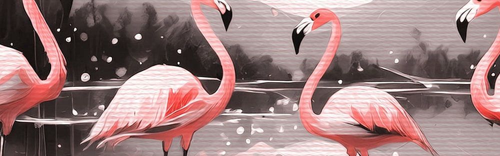 Four pink flamingo's together in a mountain lake. This digitally painted work has a panoramic format that would hang very well on a wide wall. Above the sofa, for example. This work contains pink, warm grey and black colours.