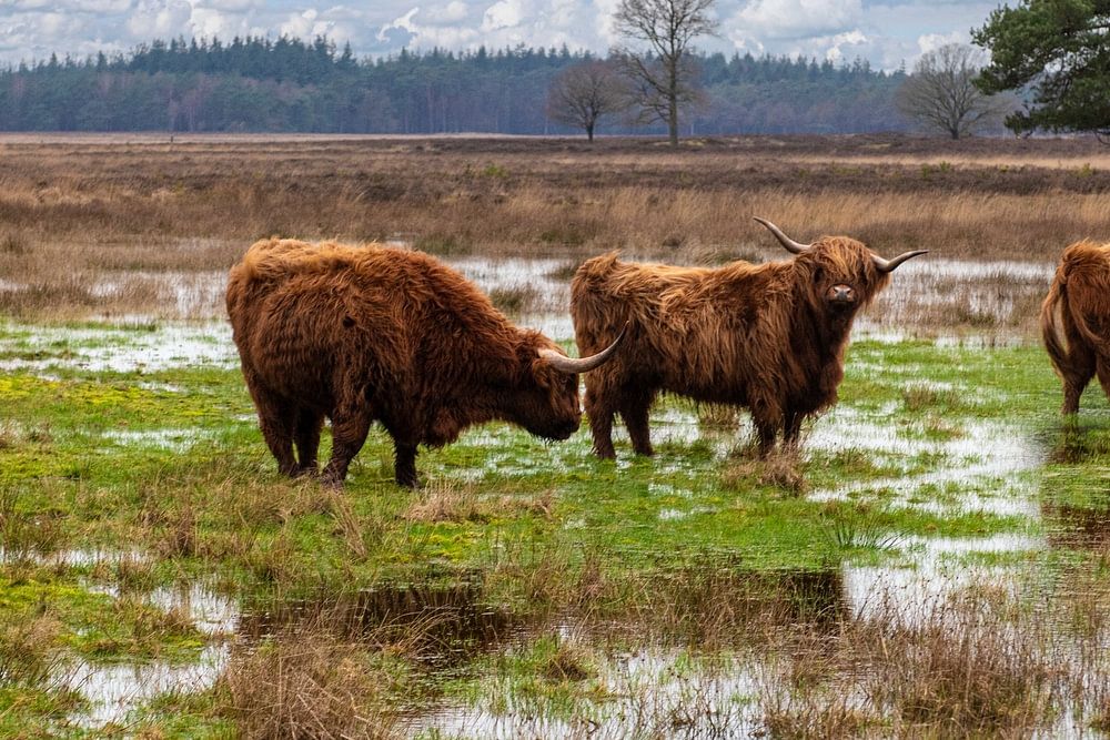 Four grazing Highlanders walk in the marshy grass looking for food in this beautiful Dutch landscape .