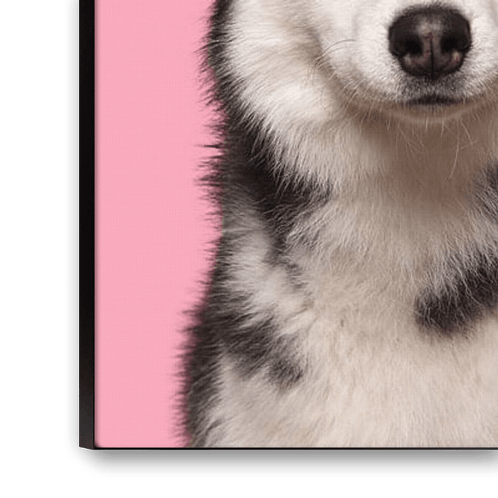 Portraits of various dogs looking at the camera on a pink background
