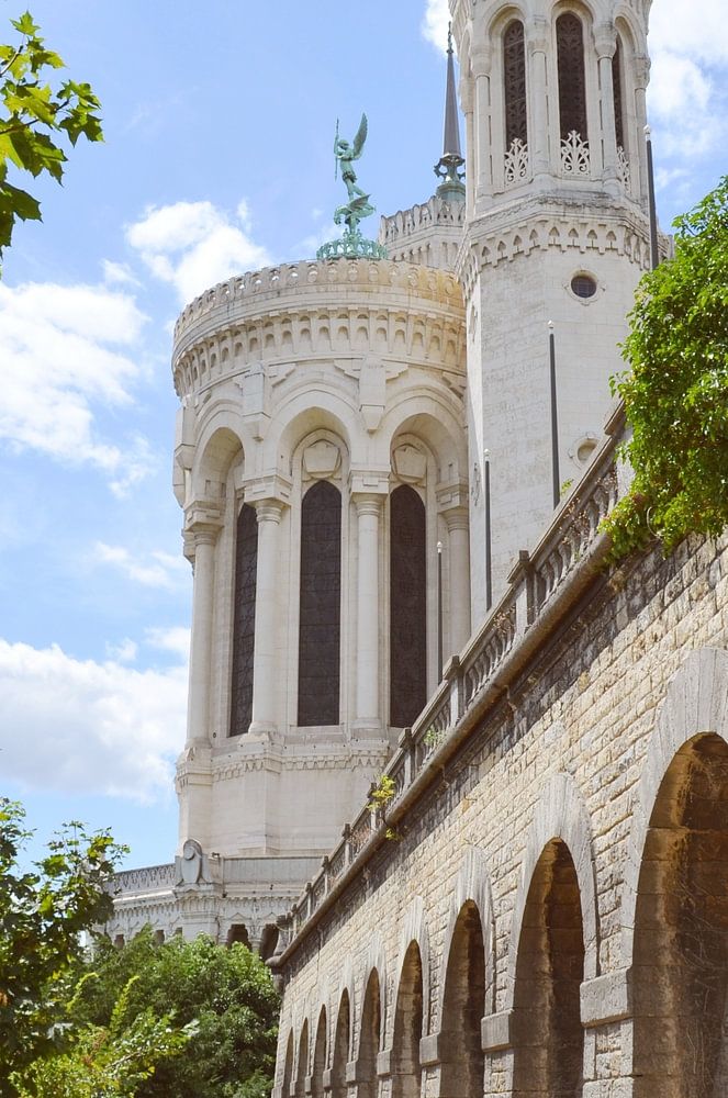 A serene garden view of the majestic Basilica of Notre-Dame de Fourvière in Lyon, France. Captured from a lush hillside, this travel photograph frames the iconic church rising above the cityscape. A blend of architectural grandeur and natural beauty in the heart of one of Europe’s most historic cities.