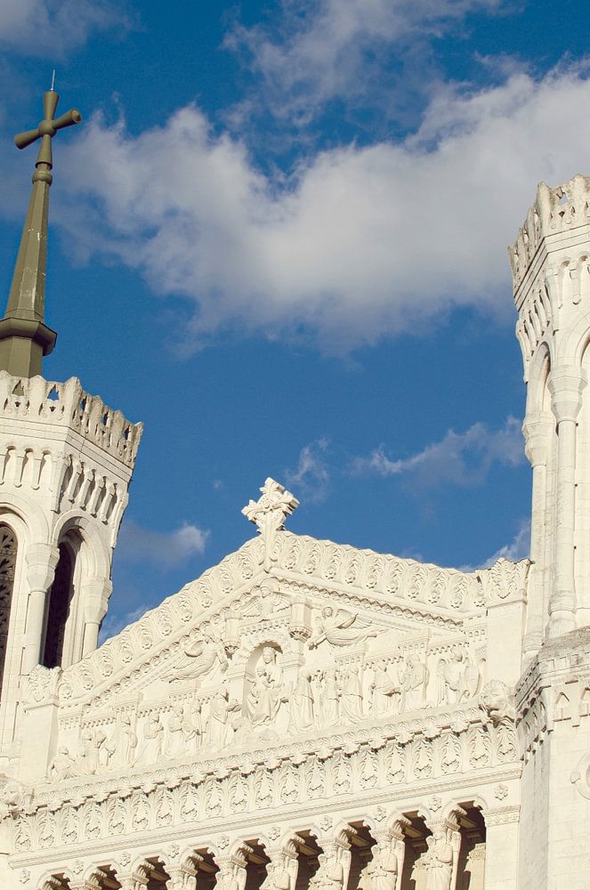 Facade of the spectacular basilica of Notre-Dame de Fourvière, at the top of the homonymous hill, in the city of Lyon. This church seduces by its beauty and mixes Gothic architecture with Byzantine and Romanesque architecture. It is undoubtedly the icon of the city of Lyon.