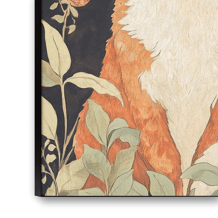 The work shows a red fox with a white chest, chin and areas of fur around the mouth, looking forwards from the front. The fur structure is worked out in detail, the eyes shine in golden yellow. The background is black with stylised floral patterns in muted shades of green and beige. The composition combines animal depictions with decorative ornaments to create a harmonious, expressive scene that combines natural elegance and stylised design.