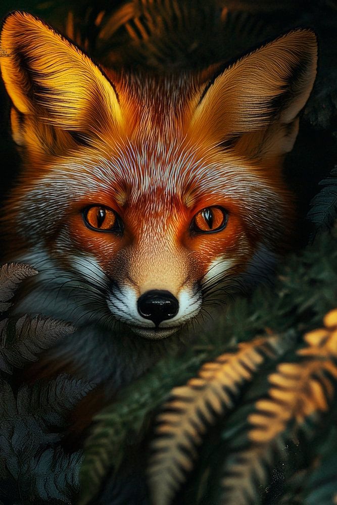A mysterious look shimmers through the dense foliage, where the warmly glowing fox's face gently peeks out. The harmonious combination of nature and animal brings life to any room. Ideal for the living room, this work of art invites you to tell stories and inspire the imagination. A touch of wilderness for your home!