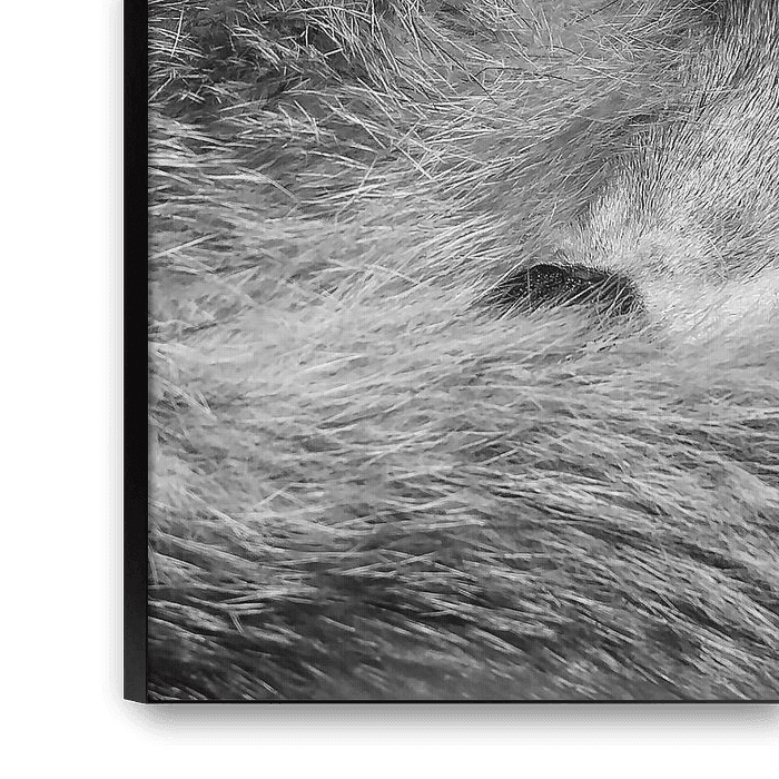 A portrait of a sleeping fox. The tail curls the fox in front of his snout to maintain extra warmth. Photo converted to black and white