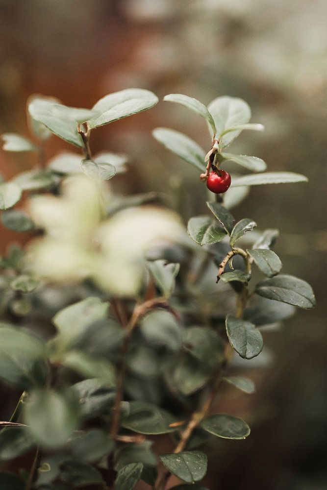 Detail of a red berry bush with solitary fruit, green leaves, surrounded by autumn colours. A familiar appearance on the Veluwe.
