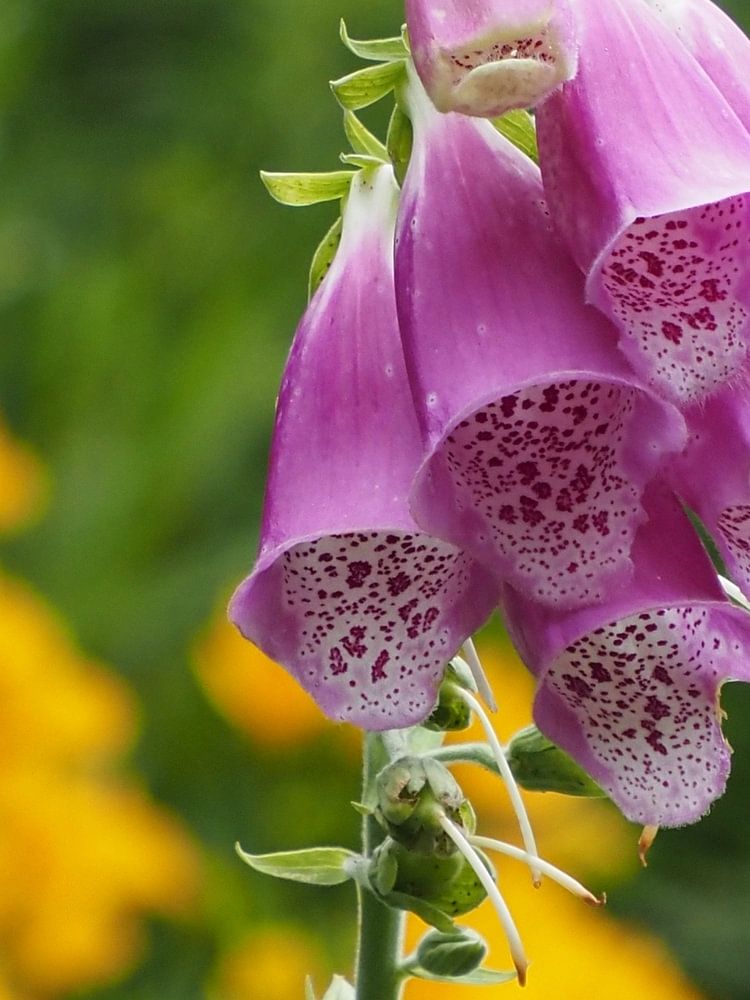 Foxglove is a summer bloomer that flowers with downward-hanging thimble-like bells, on tall upright stems. The colours are white, pink, lilac or pale yellow depending on the species. All parts of the plant are poisonous.