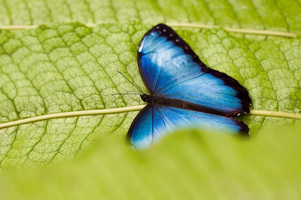 In this photograph, I wanted to capture the fragile beauty of the Morpho butterfly against the vibrant texture of a tropical leaf. The contrast between the ethereal blue and the textured green symbolises the balance between fragility and resilience in nature. This shot was shot in natural light with a focus on minimal interference with animal behaviour.