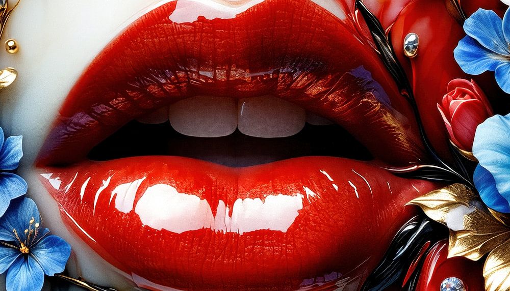 The artwork unfolds a captivating staging of elegance, sensuality and transience. At the centre is a fragment of a female face - mysteriously dissected and yet of beguiling beauty. Only the area from the lower part of the nose to just below the chin is visible. The lips glow in a deep, intense red, as if they were coated with liquid varnish - a symbol of passion, seduction and the everlasting power of the feminine.