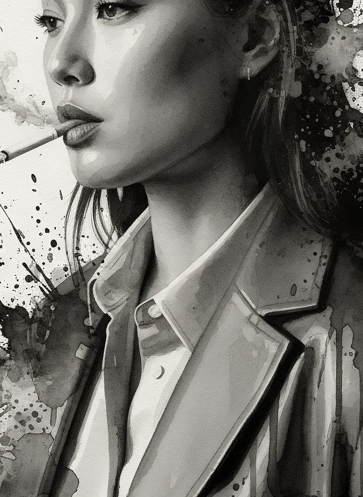 This monochrome artwork blends reality and abstraction, capturing a moment of introspection. The smoke and splatter evoke fleeting thoughts and emotions, making each portrait a unique window into the mind’s imaginative depths.
