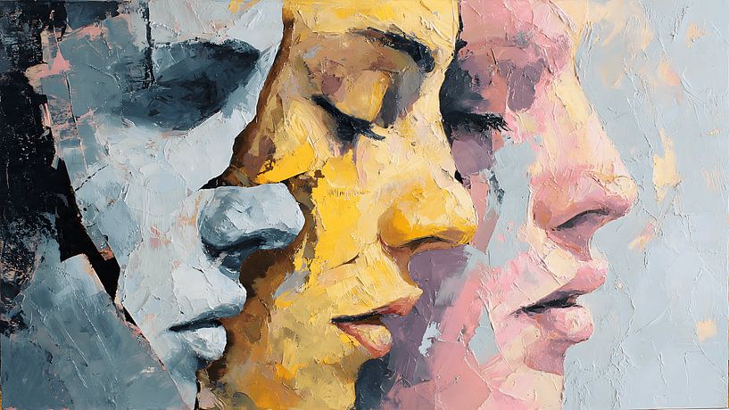 A mesmerizing abstract portrait depicting a figure split into multiple overlapping versions of itself, symbolizing emotional conflict and inner turmoil. This expressive acrylic painting features thick palette knife textures, painterly brush strokes, and a soft pastel background, creating a dreamlike and introspective atmosphere. Perfect…