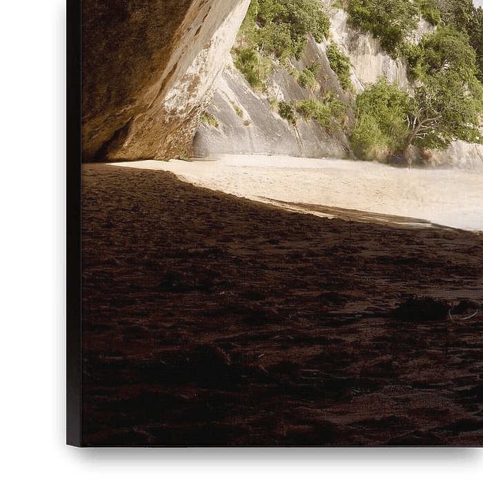 Photographed from the coastal cave, this view shows the distinctive rock formation Cathedral Cove in New Zealand. This rock is known for its fragile beauty. The use of long shutter speeds creates a hushed landscape where light, water and stone balance each other.