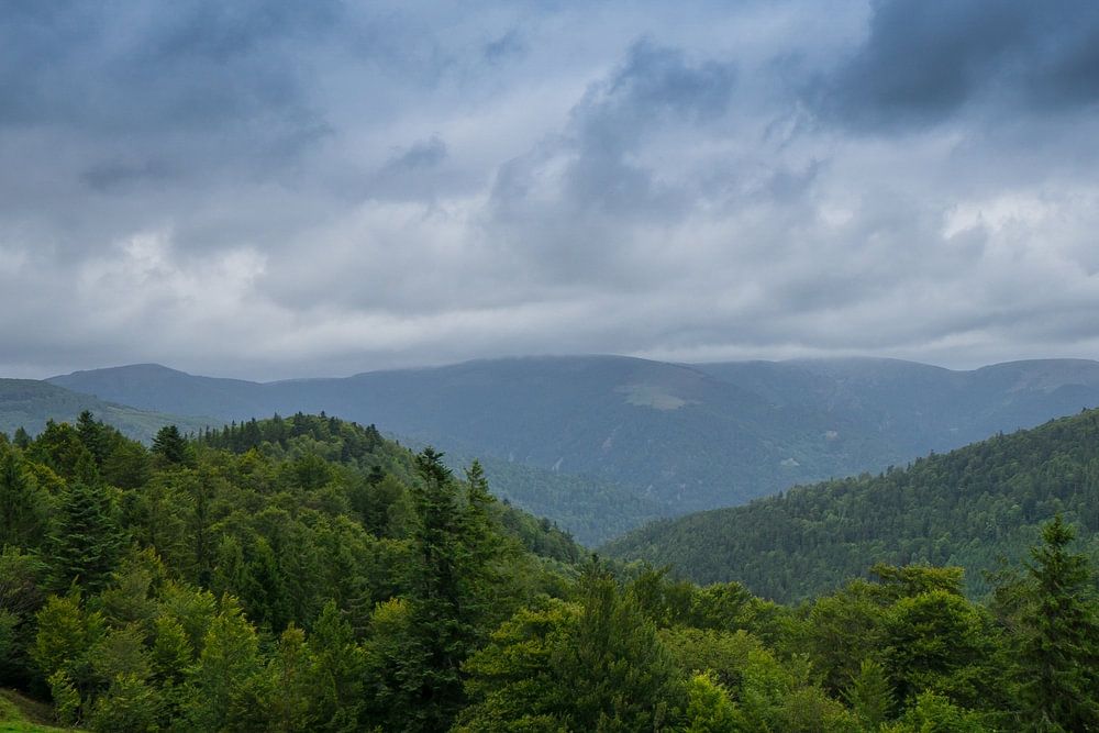 France - Dramatic sky cloud formations over french forest and mountains in alsace
