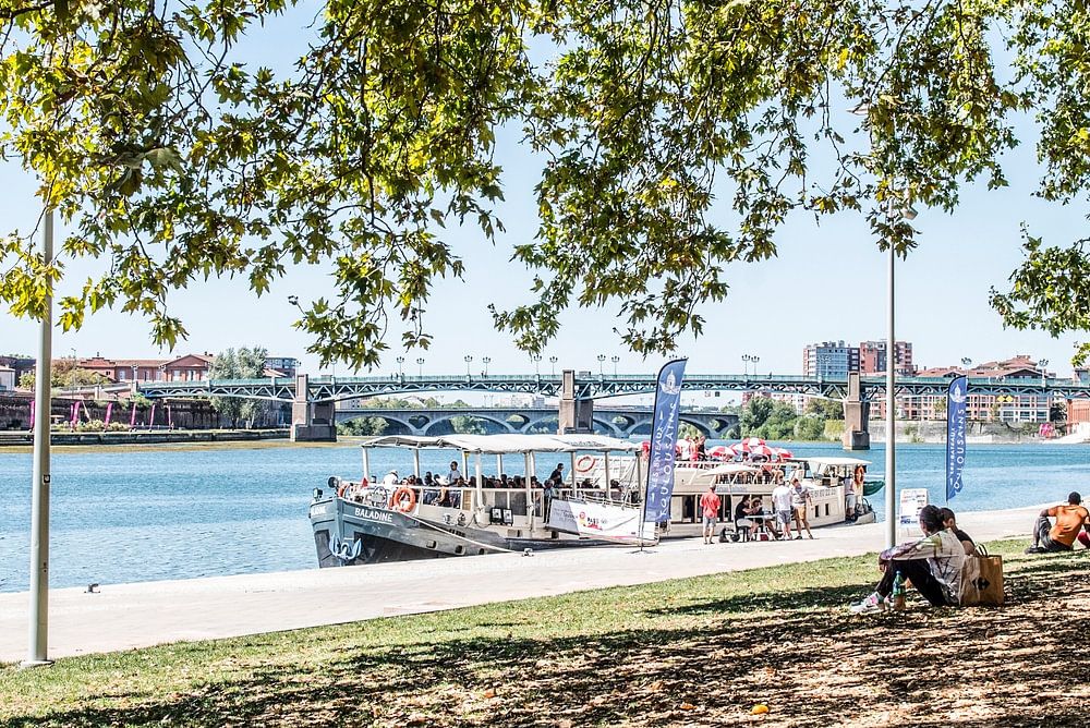 In Toulouse, along the Garonne, people enjoy the sun in the park. A floating restaurant, lies in the river. Guests sit on the terrace, enjoying the view of the bridge and the quiet rippling water. A moment of relaxation in the midst of the city.