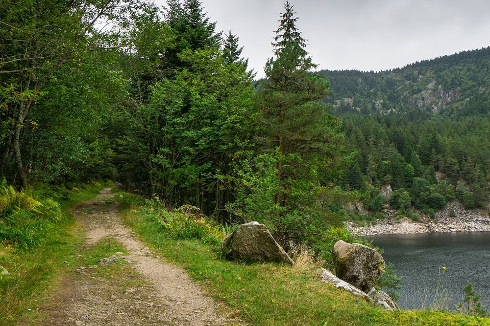 About "France - Walking path through forest next to lake in french vosges called lac noir"