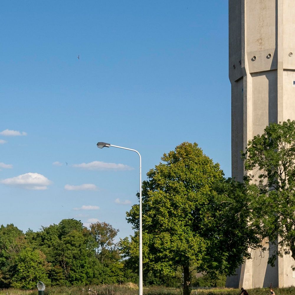 The Leeuwarderweg, seen towards Leeuwarden. The Franeker water tower was built in 1925, designed by E.C. Storm from 's-Gravenzande. The water tower has a height of over 48 metres. Around 1985, its function (storage of water and regulation of water pressure) lapsed.