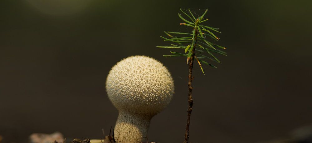 Picture of a young mushroom and young pine. made in a forest on the Veluwe. Fraternally side by side... let autumn come...