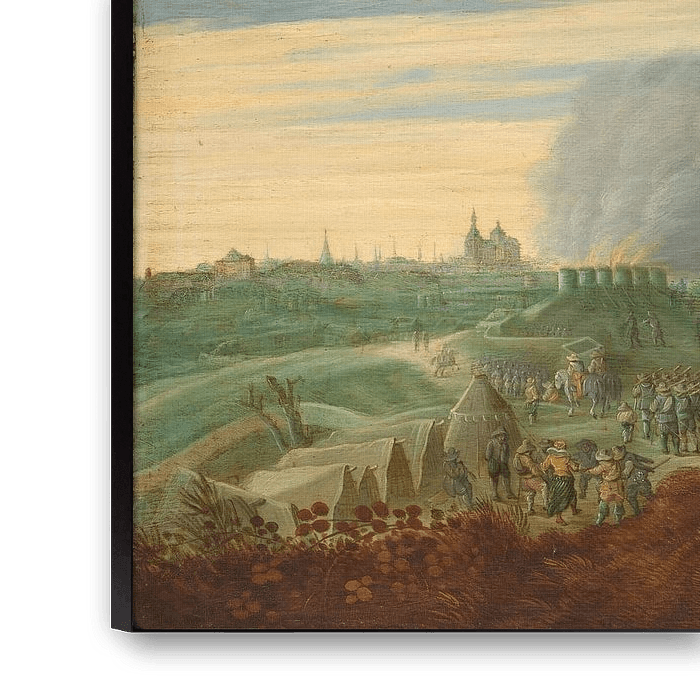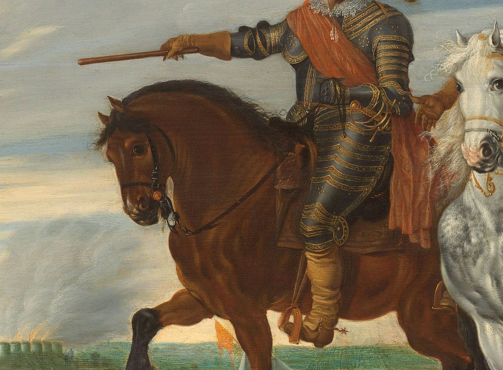 Prince Frederick Henry and his cousin Count Ernst Casimir pose triumphantly on their horses before ’s-Hertogenbosch. Frederick Henry points his commander’s staff at the Habsburg-occupied city now being stormed by Dutch forces. It was not for nothing that he was nicknamed ‘the conqueror of cities’. He captured a series of cites from the Spanish. The retaking of ‘s-Hertogenbosch in 1629 was one of the most important.