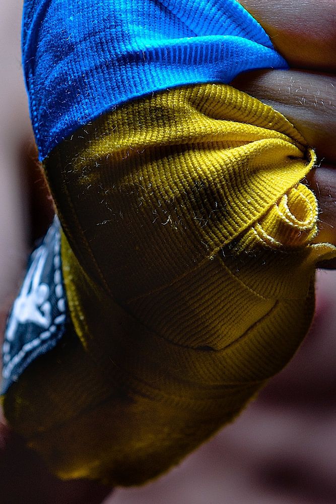 The clenched fist, fighting for the freedom of the Ukrainian people. This boxer has his hand wrapped in the colours of Ukraine, fighting for his people and the freedom of his country. Help Ukraine, No War in the World - we want to show our support for the Ukrainian people with this.