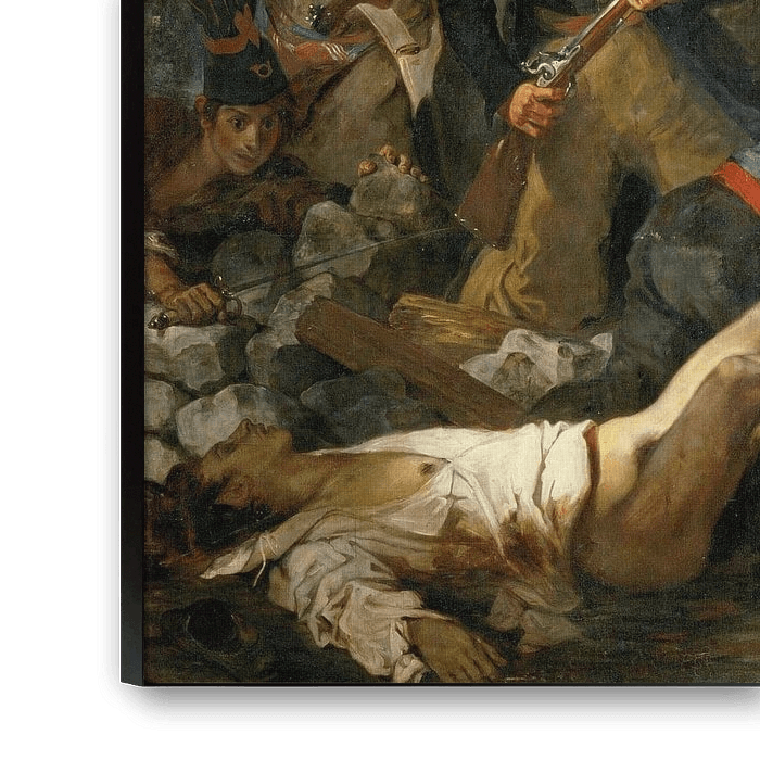 This is one of the best-known and most imitated paintings in the history of French painting. The scene shows the well-known allegory of freedom: the woman (harking back to older representation methods for allegories) with her upper body bared (nudity as a sign of vulnerability - and thus courage - in contrast to the horror taking place). The woman wears a Phrygian hat referring to freedom. To her right, one sees a little boy, referring to youth, fearlessly holding two pistols. The man to her left, looking doubtfully into the distance, is sometimes said to be a self-portrait of Delacroix, although this is not certain. What is striking about this painting is its classical composition with a central triangle and its topical subject matter, where many romantics often harked back to the past. This painting shows that the three classes (clergy, nobility and bourgeoisie) were in favour of the revolution, because in addition to the woman, the three classes are present. Thus, all the classes opposed the established order. The flag the woman is holding is also not just the French flag. It was the new flag with three colours di
