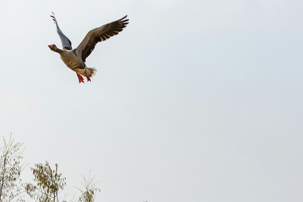 In this vibrant shot, two geese soar into the clear spring air above a vast, natural landscape. With majestic wing beats, they soar over the reeds and soft green meadows, while the silhouettes of traditional windmills appear in the background, providing a peaceful and nostalgic backdrop. The geese seem almost weightless, their wings spread wide, as if they embody the spirit of freedom itself.