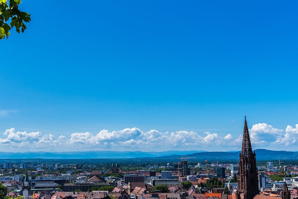 Freiburg im Breisgau city view in summer under green tree by adventure-photos