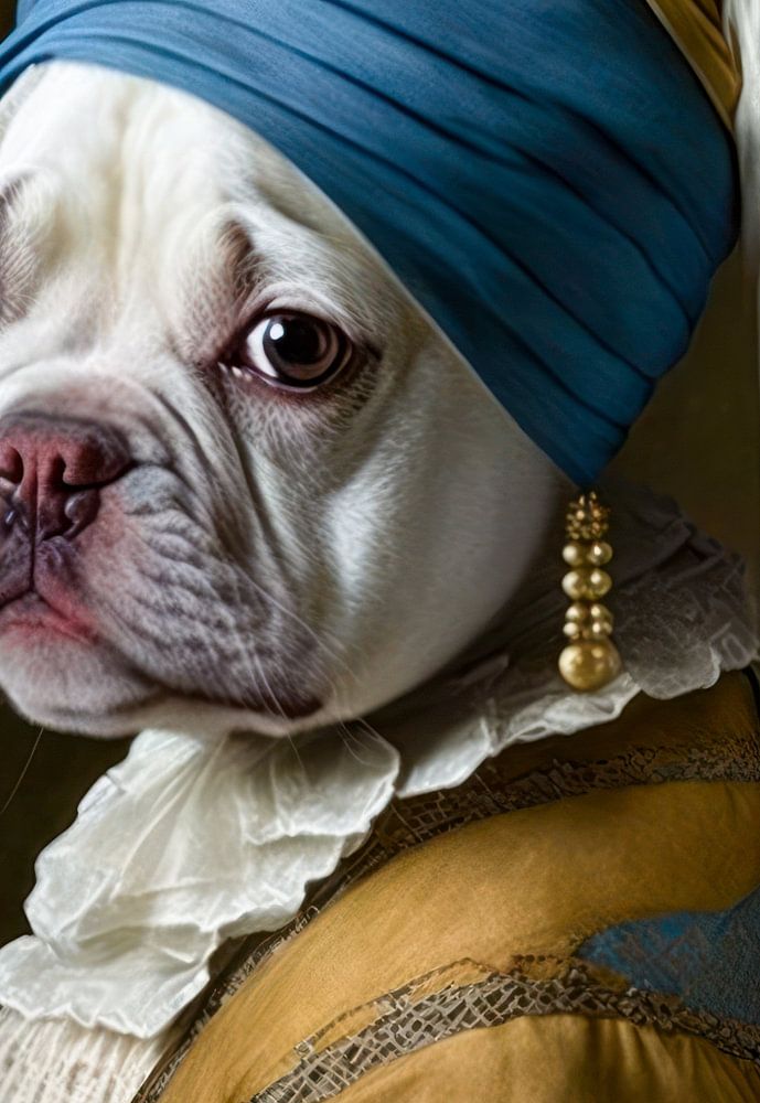 French Bulldog with Earring. This is a painting of a French Bulldog with an earring, a popular breed of small dog with a unique look and personality. The painting captures the dog's charm and playfulness, along with the striking earring that adds a playful twist to the image.