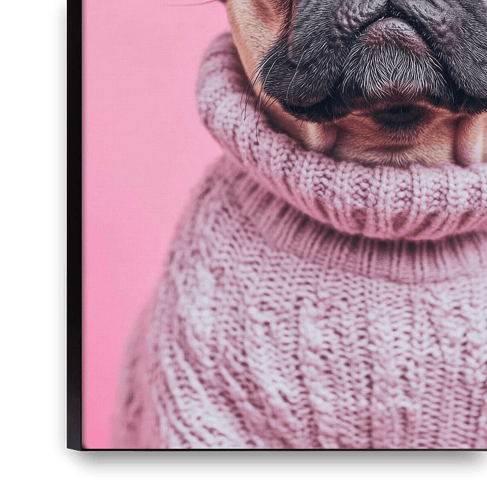A French bulldog charm shines in a soft pink, wrapped in a cosy, knitted outfit. The large, round eyes sparkle with curiosity, while the ears stick out like little sails. The sweet facial expression conveys a mixture of elegance and innocence - a true fashion statement on four paws!