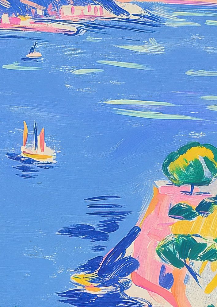 This colourful painting shows the French Riviera in soft pastel colours. Boats and yachts glide across the calm waters, while lush green vegetation lines the cliffs and hills. The vintage style lends the scene a nostalgic charm, while harmonious colour compositions emphasise the peaceful coastal landscape. Broad brushstrokes and soft light create depth and atmosphere, so that the work conveys both tranquillity and vibrancy. The composition artistically captures the beauty, elegance and splendour of the Riviera and invites you to dream.