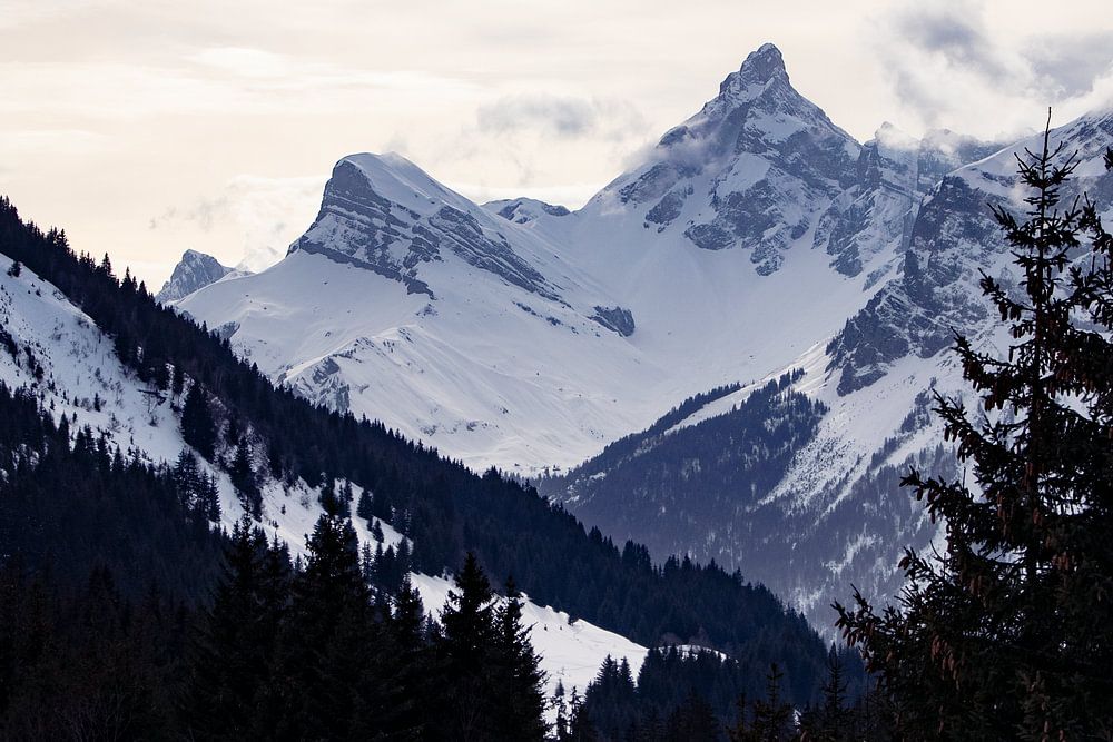Pointe d'Areu in France. A beautiful mountain range to look at. You see large mountains covered with snow and in the foreground are still green pine trees.