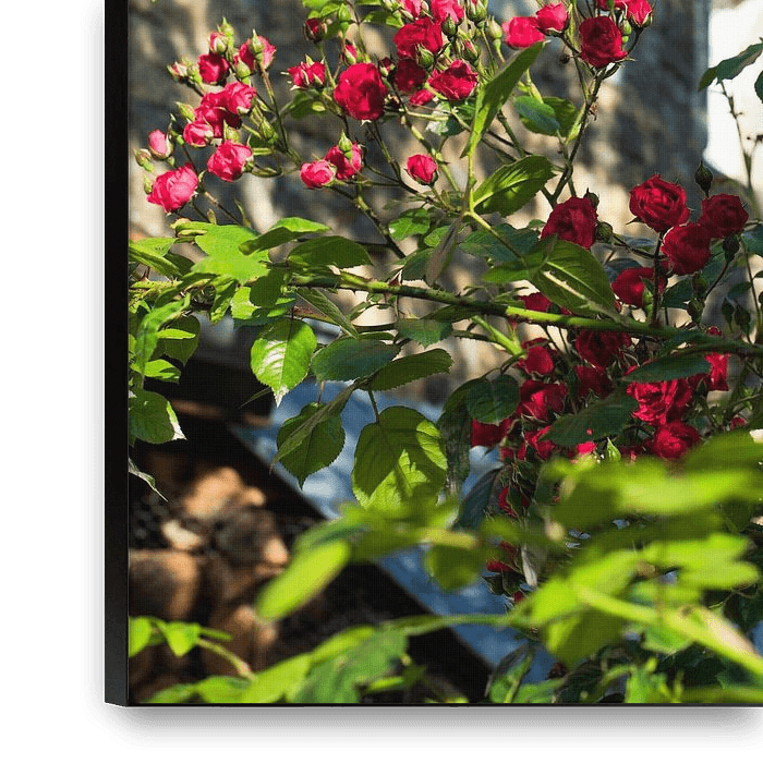 Rose bush with facade of a rural house. Made in La Douce France. Depicts a rural and summer atmosphere.
