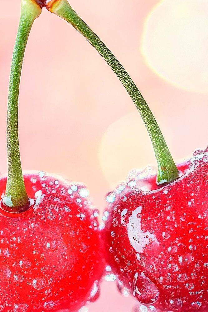 Two juicy red cherries glow in the soft light, surrounded by a magical glow reminiscent of a summer's day. The water droplets on their surface give them a refreshing appearance. This work of art brings a fruity freshness to any kitchen or dining area and stimulates the senses with its vibrant blaze of colour.