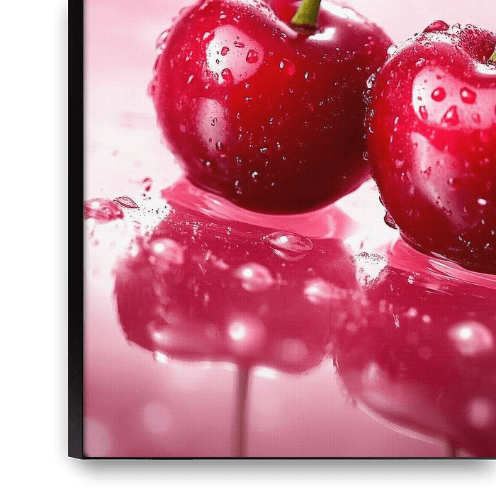 Juicy, bright red cherries, fresh from the tree, surrounded by delicate drops of water, shine on a soft, pink background. Their glossy surface and stylish stems add a touch of freshness and cheerfulness to any room. This artwork is perfect for the kitchen or dining room to create an inviting accent.
