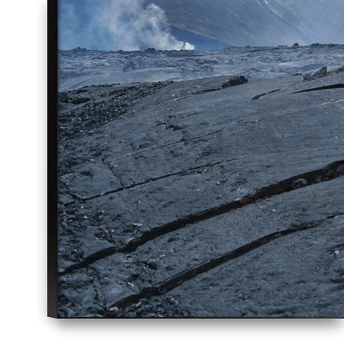 The volcano has just finished its eruption. There is smoking lava everywhere. The forces acting on it have caused the lava to crack or collapse.
