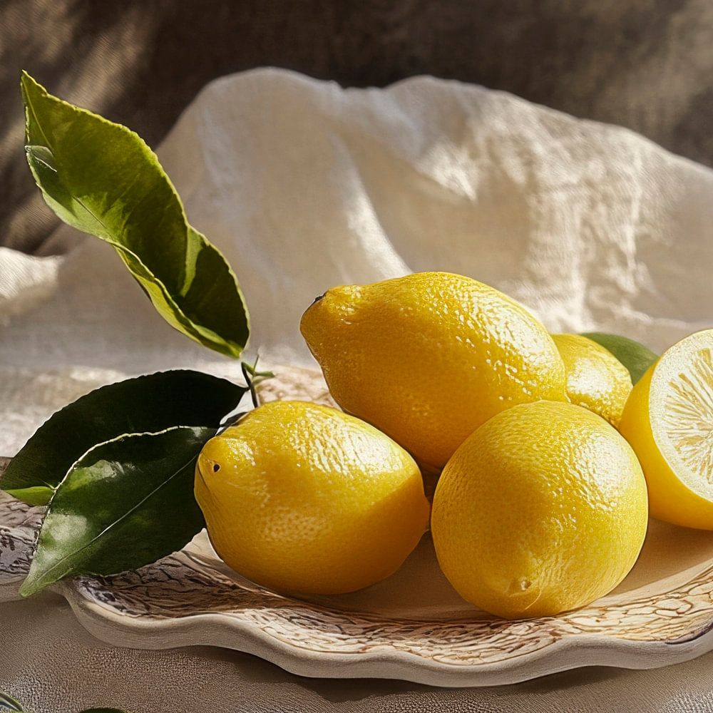 Bright yellow lemons gleam in gentle rays of light on an elegant plate, surrounded by delicate, fresh leaves. The contrast between the matt background and the radiant fruit creates an inviting atmosphere. A halved lemon reveals its juicy interior - a promise of refreshment and sparkling joie de vivre.
