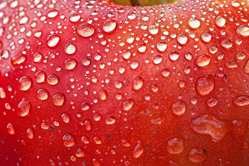 This beautiful image shows a brilliant red apple enveloped in dewdrops, contrasting vividly against a background of soft autumn tones. The intense colours and fresh look of the fruit bring a sense of natural beauty and simplicity. The subtle play of light on the water droplets gives a sense of freshness and purity, while the warm colours of the leaves evoke a cosy, autumnal atmosphere. Perfect for any space that could use a touch of natural elegance, this image invites appreciation of nature's little wonders.