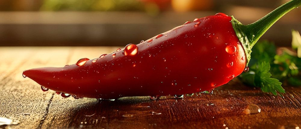 A vibrantly bright chilli lies alone on a rustic wooden table, surrounded by fresh herbs and subtle drops of water that emphasise its shine. This culinary composition brings vibrant colours and a practical atmosphere to any kitchen, ideal for cooking enthusiasts who want to celebrate a passion for spice.