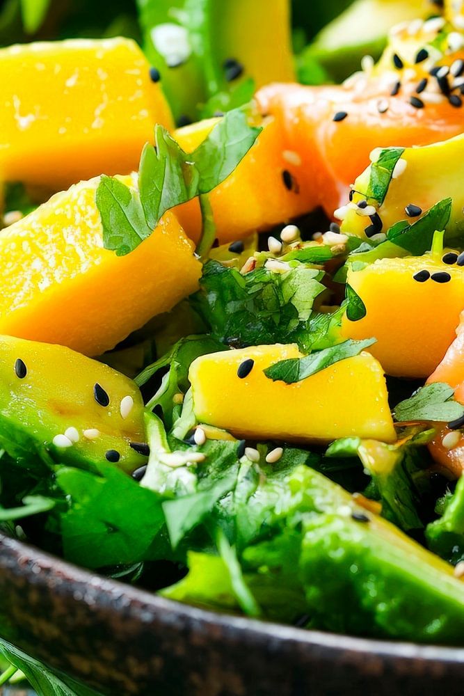 A fresh, colourful treat invites you to feast: juicy mango pieces and avocado harmonise perfectly with crunchy greens. The dark sesame seeds add an elegant accent. This lively composition brings flavour and joie de vivre to the kitchen and is ideal for a culinary eye-catcher that will inspire you to try out your own recipe ideas.