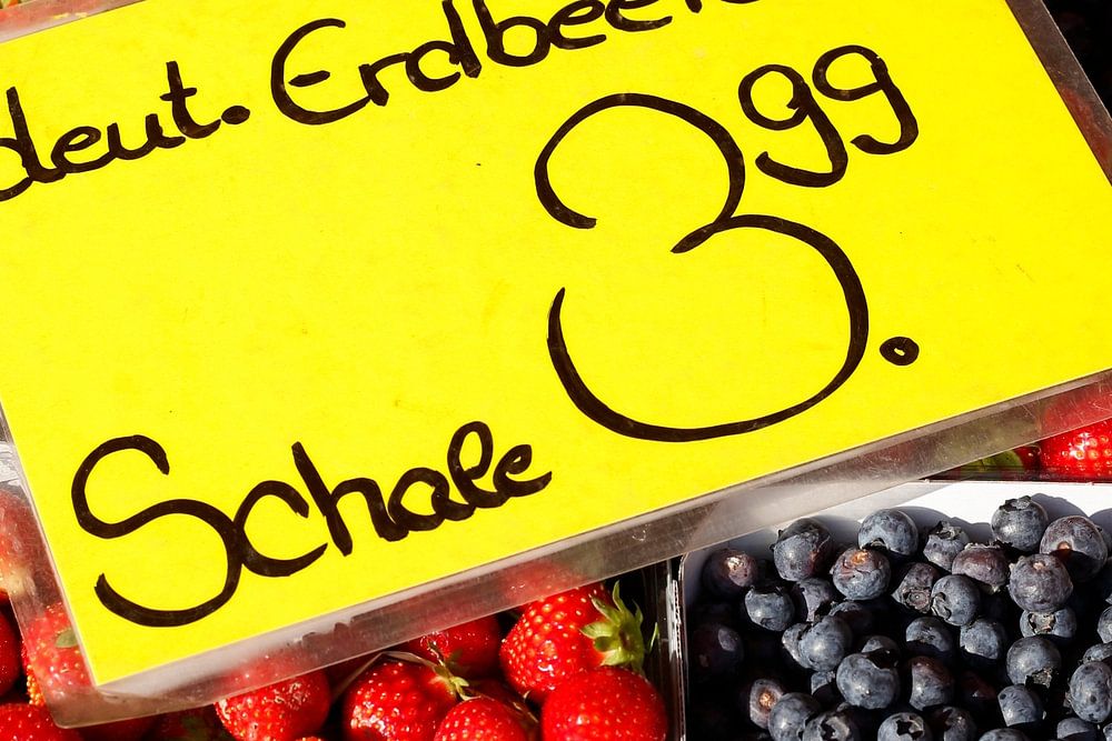 About "Fresh strawberries and blueberries in trays on a market stall, Bremen, Germany"
