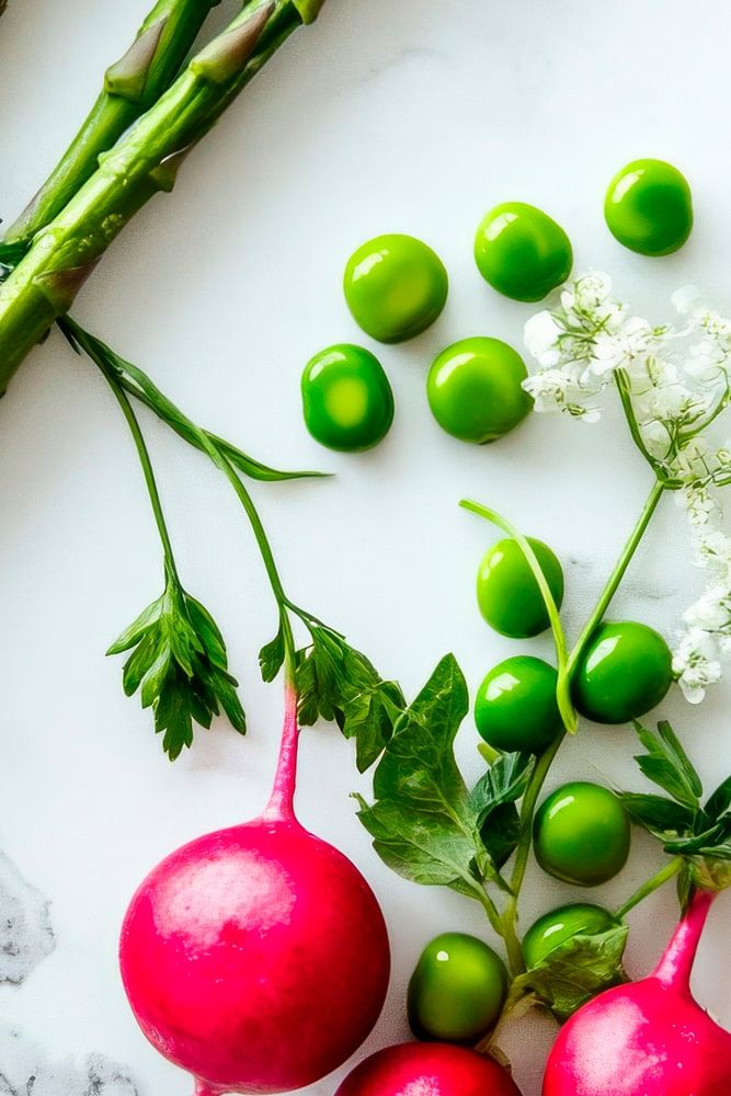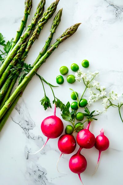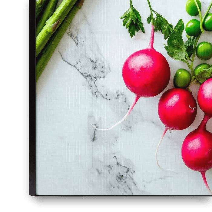 Vibrant colours and fresh nature come together in this arrangement of crunchy radishes, tender asparagus and bright green peas. The harmonious interplay of green and pink brings an inviting atmosphere to any kitchen and inspires delicious creations. Perfect for the heart of the home - where flavour and creativity are at home.