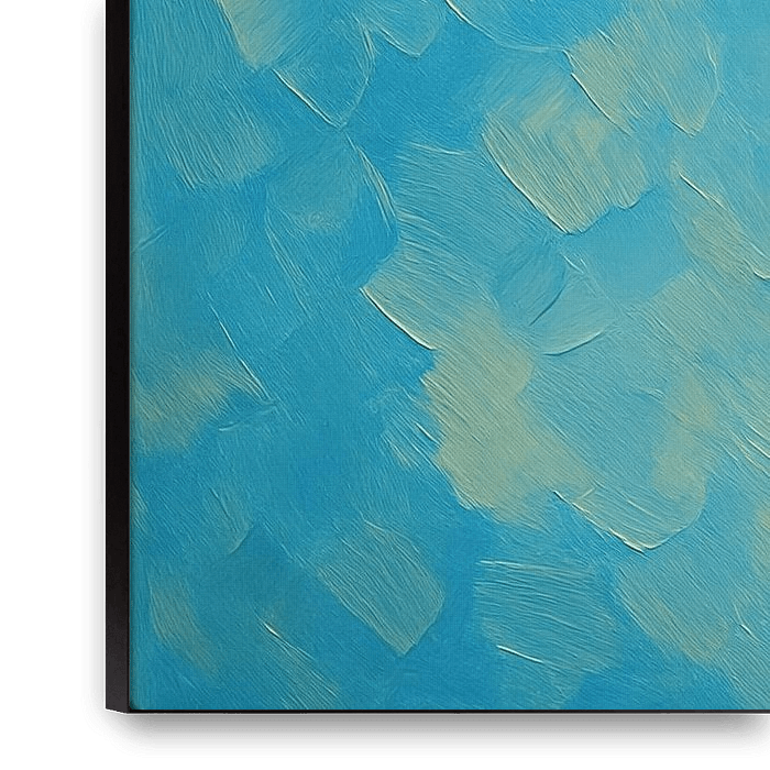 A curious giraffe looks straight at you, with expressive eyes and warm spots that shine subtly. The blue background with visible brushstrokes gives rhythm and air to the image, while the soft shadows on the muzzle create depth. The contrasting play of colours between cool and warm tones creates a fresh, cheerful look. This artwork works…