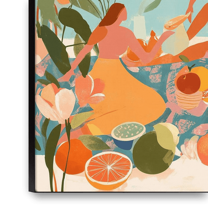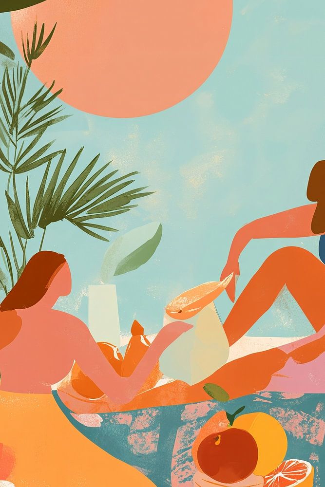 A cheerful and colorful artwork depicting two friends enjoying a relaxing beach picnic, surrounded by tropical plants, citrus fruits, and flowers in warm coral and gold tones. The illustration exudes a Mediterranean feel with a serene sunset in the background, perfect for those who want to capture the beauty of friendship and nature in…
