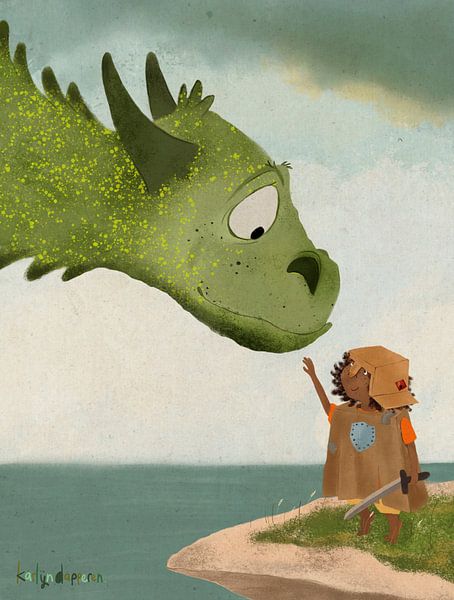 An unexpected friendship between a friendly dragon and a brave knight. A magical world, with fun, recognisable details for children. A girl who made her own knight costume out of an old brown bag and some duct tape.